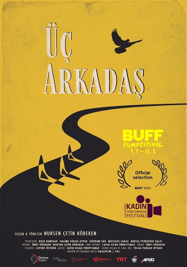 Nursen Çetin Köreken’in yazıp yönettiği “Üç Arkadaş” filmi 09 – 15 Mart tarihleri arasında Malmö’de düzenlenecek olan dünyanın en prestijli Çocuk ve Gençlik Film Festivalleri’nden biri olan 41. BUFF Film Festivali’nin uluslararası / resmi yarışma bölümü ile 26 Şubat – 2 Mart 2024 tarihlerinde İzmir’de yapılacak olan 7. Uluslararası Kadın Yönetmenler Festivali ulusal yarışma bölümünde gösterilecek.